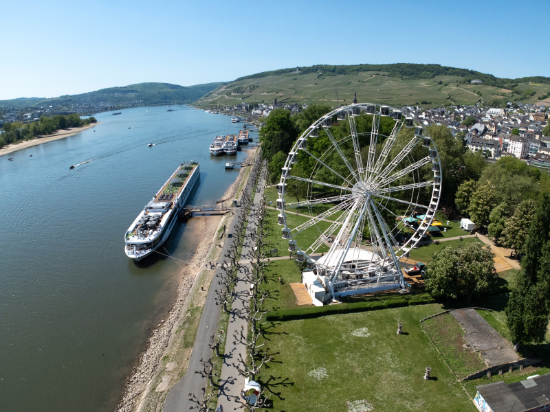 Bis 9. Juni 2025 bietet das 48 Meter hohe "Rüdesheim Eye" in 36 verglasten Gondeln beeindruckende Ausblicke auf Bingen, Rüdesheim und das Welterbe-Tal.